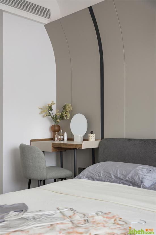 有女主人在的家,自然少不了精致的梳妝臺,床頭一邊采用了當下流行的木質(zhì)化妝桌替代床頭柜,略比床頭柜富裕一丁點的空間也被精準利用。