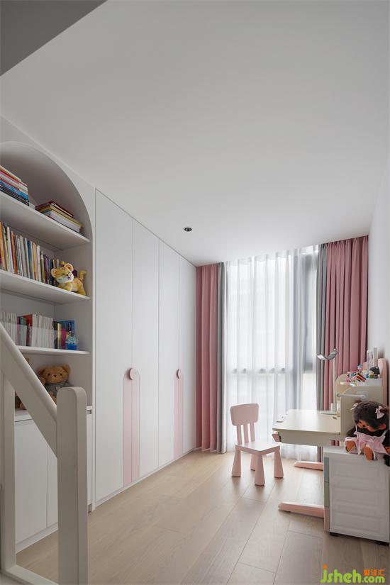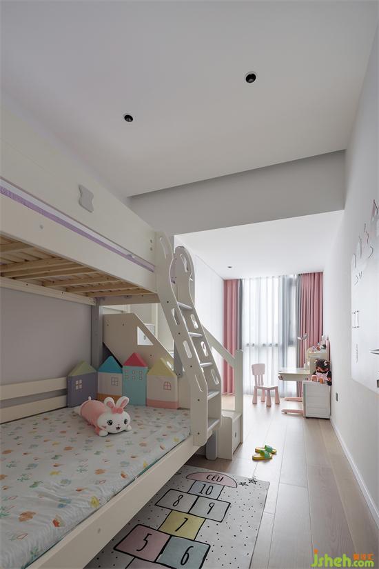 兒童房的落地窗區(qū)域也由原來陽臺外拓而得,高低床、衣柜、書柜一列式的排布,為兒童房創(chuàng)造了學習區(qū)、娛樂區(qū)和休息區(qū),功能齊備也不局促,家裝設(shè)計雖然原有天花梁位很低,但小小的半片云朵擱板遮擋,恰巧解決了中央空調(diào)的實力搶鏡,還給兒童房增添了一絲童趣。