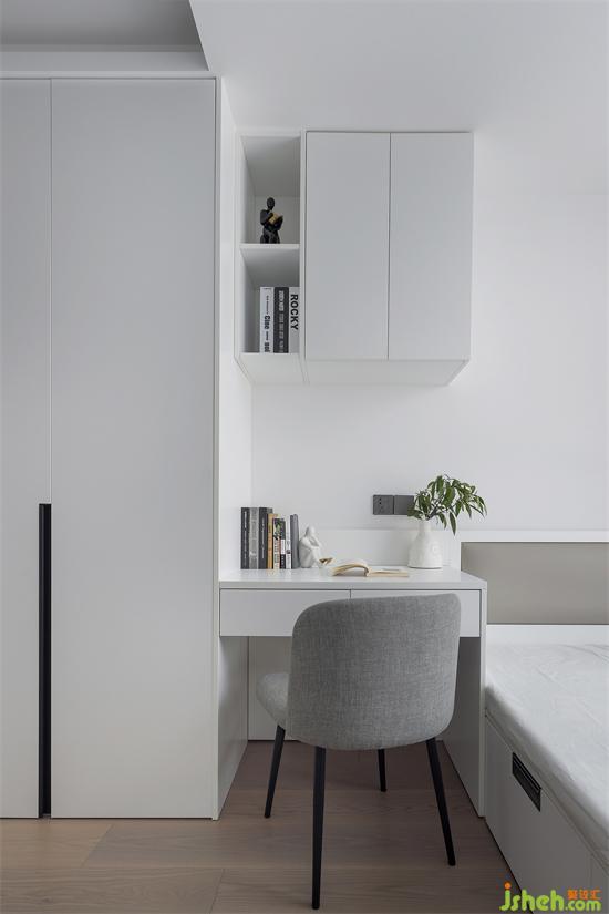 入戶門邊是一間次臥,因為原來陽臺封裝融入室內(nèi)的影響,天花梁位偏低,我們索性就把梁位作為空間區(qū)分,一邊安排衣柜和書桌,一邊安排上榻榻米床,滿足了業(yè)主對書房的辦公需求,又兼?zhèn)淞艘欢ǖ氖占{功能,原本局限的空間通過陽臺外拓,瞬間擴充了幾個平方!