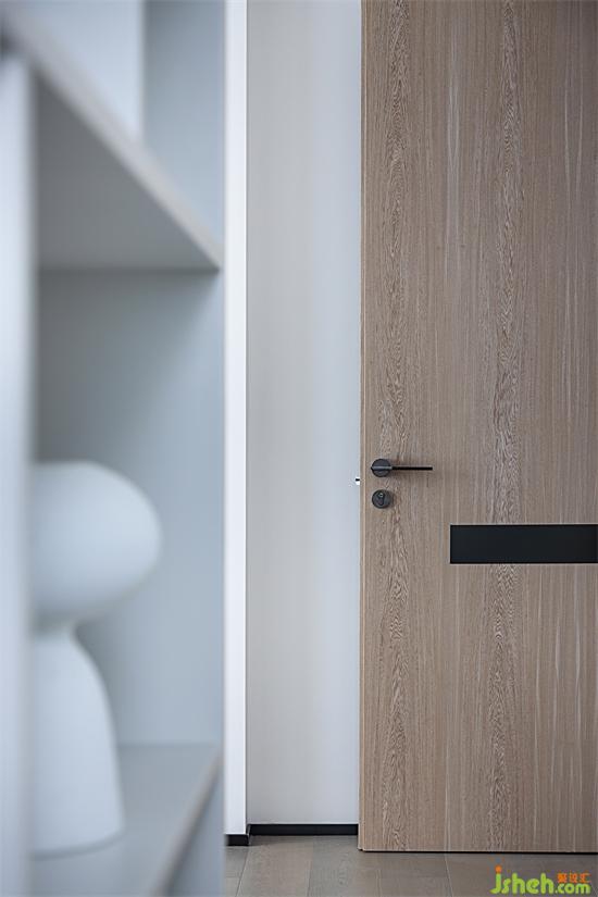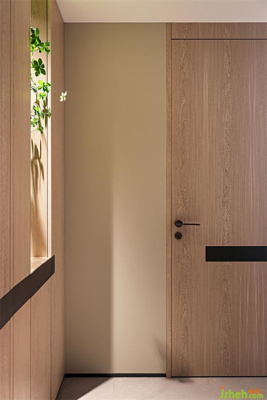 過道采用儲物柜填充凹陷部門,增加收納功能。柜門統(tǒng)一配上黑色腰線,與房門向外拓展至墻面的黑色腰線相呼應(yīng),這個過道簡直太愛了!
