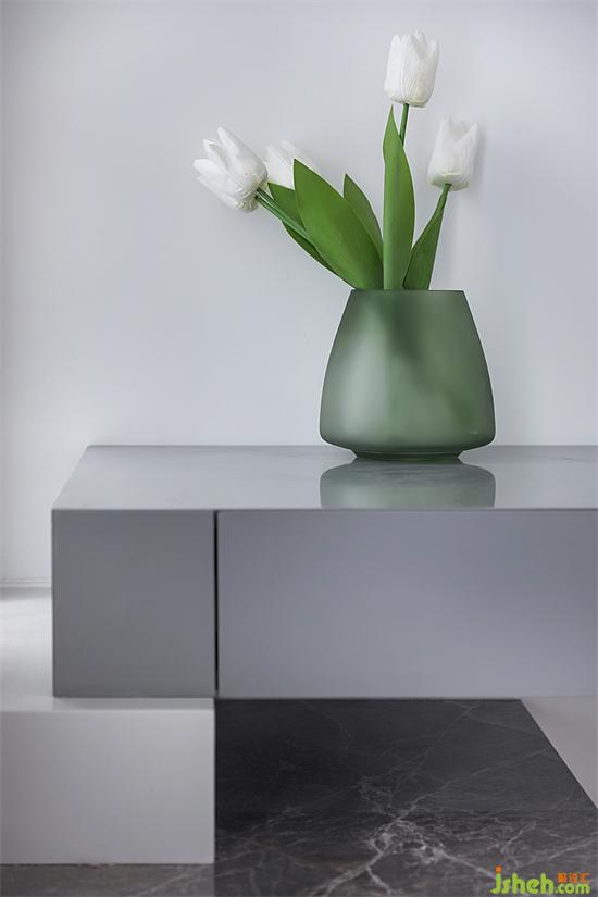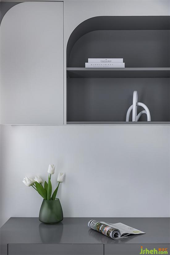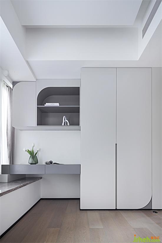 整墻衣柜連接書桌書柜以實用性為主,白色搭配全屋灰色主調(diào),并在造型上延續(xù)整屋弧形元素,使得空間更具整體感。