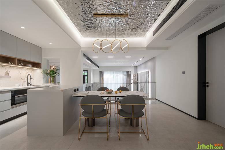 在這里隨處可見(jiàn)元素拼接呼應(yīng),淺色系的應(yīng)用更是讓餐廳視覺(jué)上顯大。天花的水波紋板使暖暖的燈光鋪滿整個(gè)空間,彌補(bǔ)了餐廳光線不足的問(wèn)題。在光的反射作用下,Baxter餐椅的黃銅框架熠熠生輝,燈光柔和不刺眼,餐椅造型極致簡(jiǎn)約,盡顯輕奢大氣!