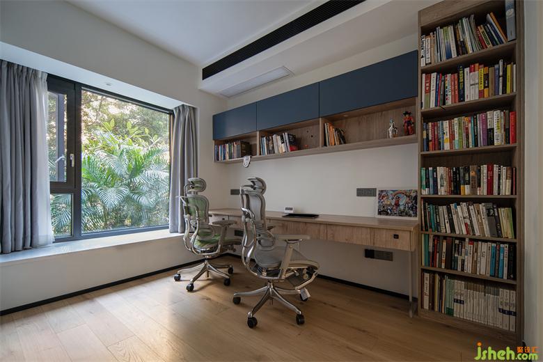 3米2的加長(zhǎng)書桌加上落地書柜,營(yíng)造沉浸式的讀書一角。書房選用了木紋地板,顯得輕松溫馨又不拘謹(jǐn)。書房里敞開(kāi)的窗戶,迎來(lái)的是清爽的微風(fēng)和天然的光線,在這年頭,最快樂(lè)的事莫過(guò)于兩個(gè)人一起窩在書房里享受歲月靜好,一起品味書中人生。