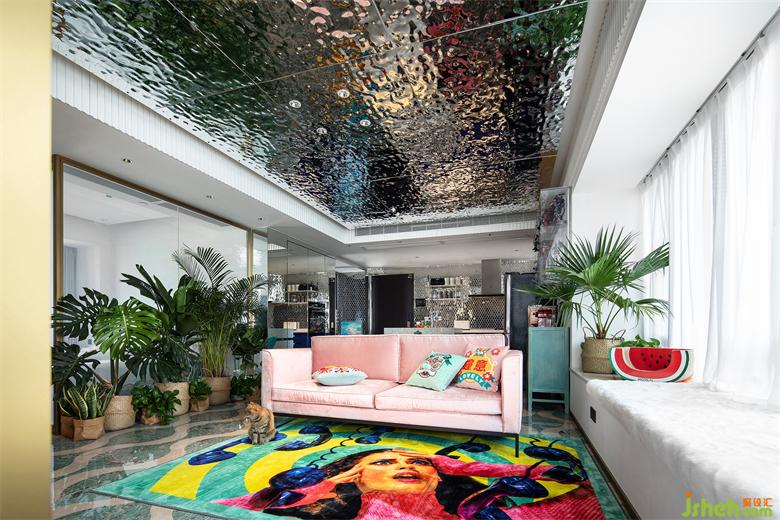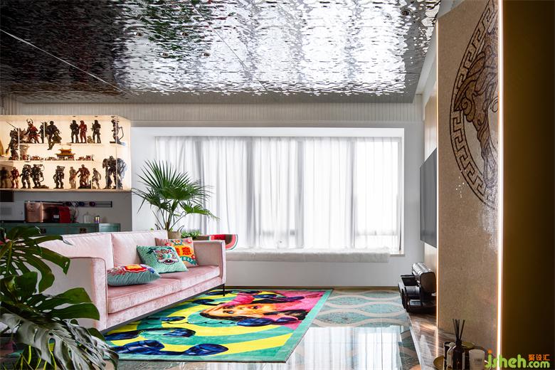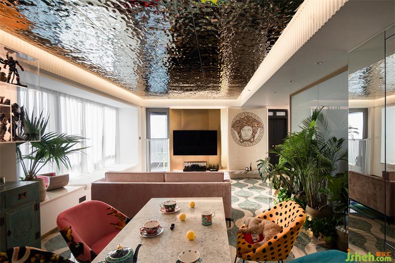 移步客廳,地面通鋪森林綠水波浪拼花地磚,天花則選用水波紋不銹鋼板交相輝映,天花周邊圍上乳白色木格柵加以渲染,仿佛圈住了一汪波光粼粼的湖水,不經(jīng)意間,blingbling的閃耀映襯出星光點(diǎn)點(diǎn)的浪漫。