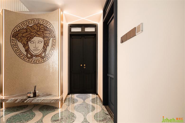 客廳的另一端,是富有小心機的電視背景墻。金屬材質手感細膩不易沾灰,搭配斜面、弧形的元素,穿插式設計令背景墻更加生動立體。家裝設計個性化的VERSACE拼花彰顯獨特的異域風情,更傳遞著風格鮮明、致命吸引力的濃厚藝術寓意。
