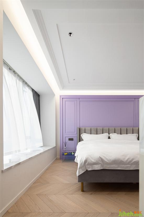 小姐姐希望主臥跟公共區(qū)域有明顯區(qū)分,進入臥室要有放下一切煩惱的舒適感。于是,設計師在主臥的設計上刻意簡化裝飾感,以仙女標配色——香芋紫作為空間的主色調(diào)!床頭背景是一面香芋紫色輕法式護墻板,搭配漸變色極簡亞克力床頭柜和高級灰高背軟包床,材質(zhì)軟硬結合,色調(diào)相輔相成,在懸浮吊頂和周邊燈帶的映照下,共塑一室溫柔。