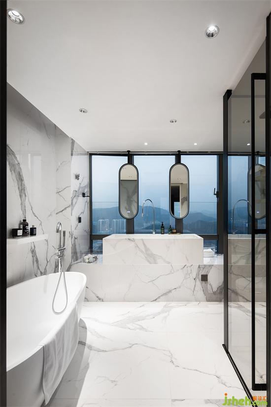 白色落地式獨立浴缸搭配銀色潔具,純凈中透露著高級感。墻面加設巖板置物架,洗浴用品可以隨手擱置,便捷又實用。