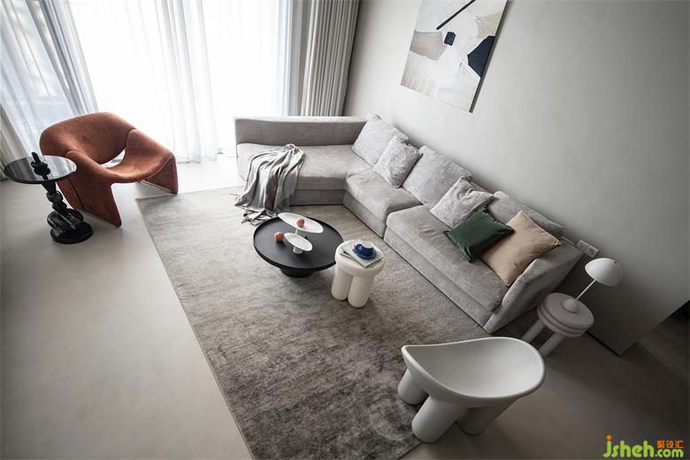 臟橘色點(diǎn)綴為現(xiàn)代簡(jiǎn)約的家?guī)頃r(shí)尚氛圍,圓形桌更是給嚴(yán)肅設(shè)計(jì)帶來一絲活潑跳躍之感。家裝設(shè)計(jì)使用弧形元素貫穿整個(gè)客廳,加之不同形狀幾何軟裝的疊化設(shè)計(jì),弱化水泥色帶來的嚴(yán)肅感,反倒給這個(gè)家?guī)頊剀案杏X~