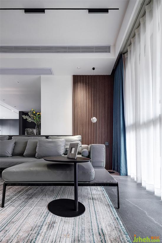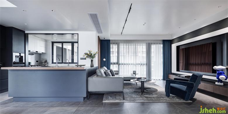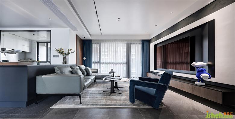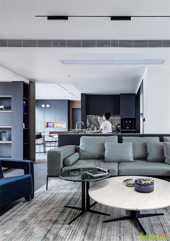 以Y先生最喜歡的深海藍(lán)為基調(diào),搭配沉穩(wěn)、酷雅的深灰色和木色,選用烤漆、大理石、木格柵和絨布等多種材質(zhì),打造極具高雅格調(diào)的現(xiàn)代極簡空間。