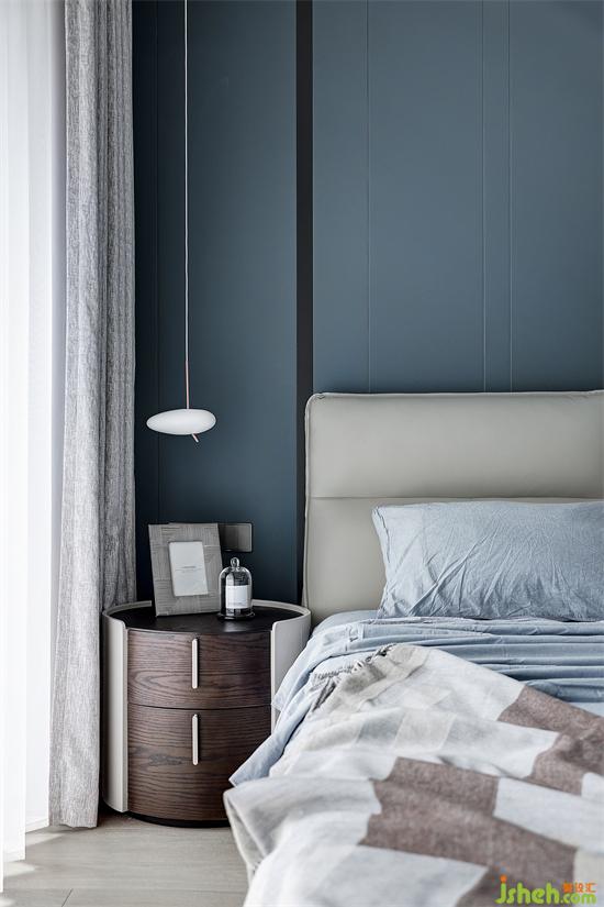 深海藍皮質硬包、黑色不銹鋼、木格柵,延續(xù)客餐廳的主要用材,復刻的設計手法令主臥更平衡、和諧。