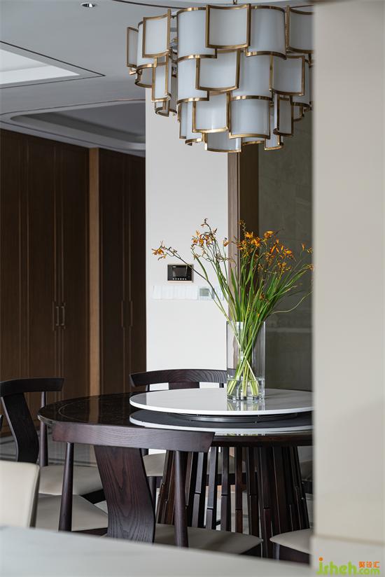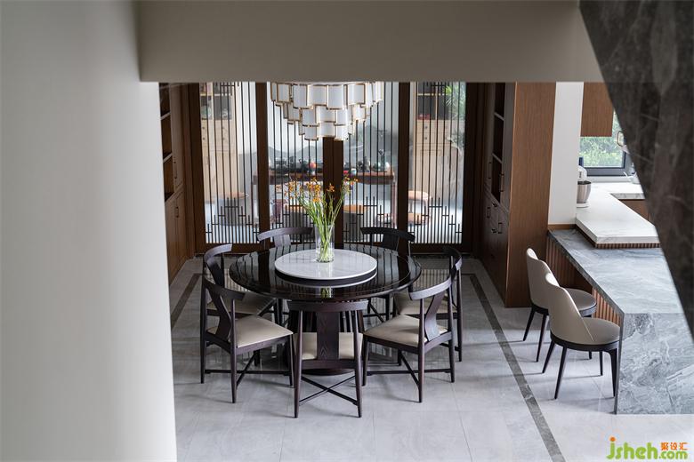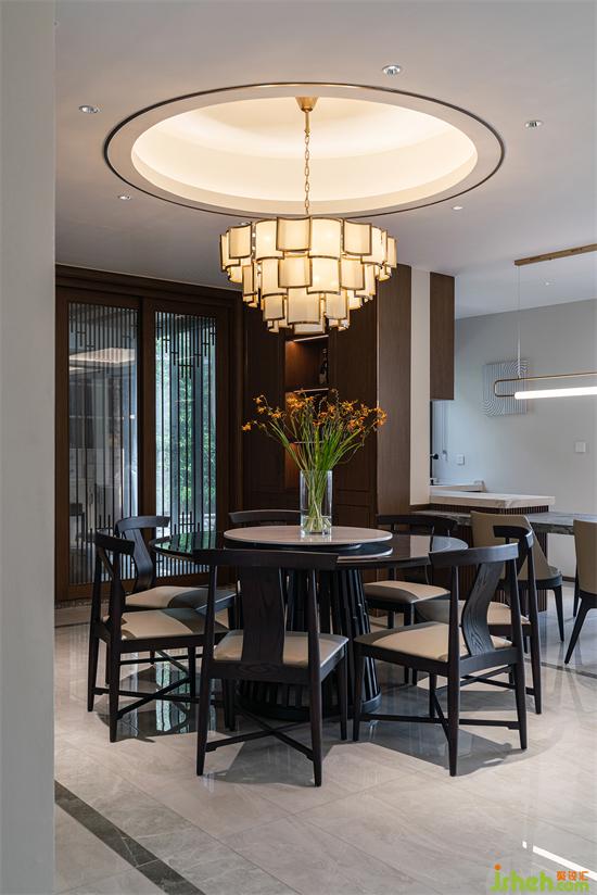 空間設(shè)計(jì)講究在日常生活中顯示品位與品質(zhì),餐廳背后用兩個(gè)儲(chǔ)物柜,別墅裝飾了展示的區(qū)域,方便業(yè)主藏酒展示,在節(jié)日聚餐中方便拿取,為空間提升檔次。