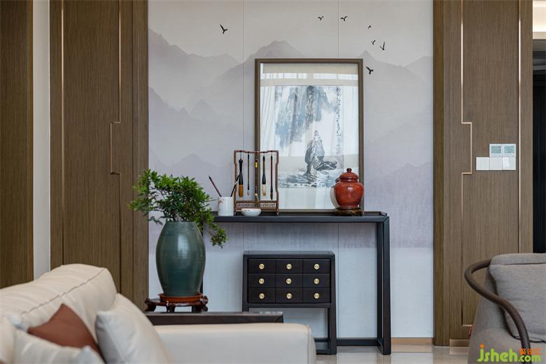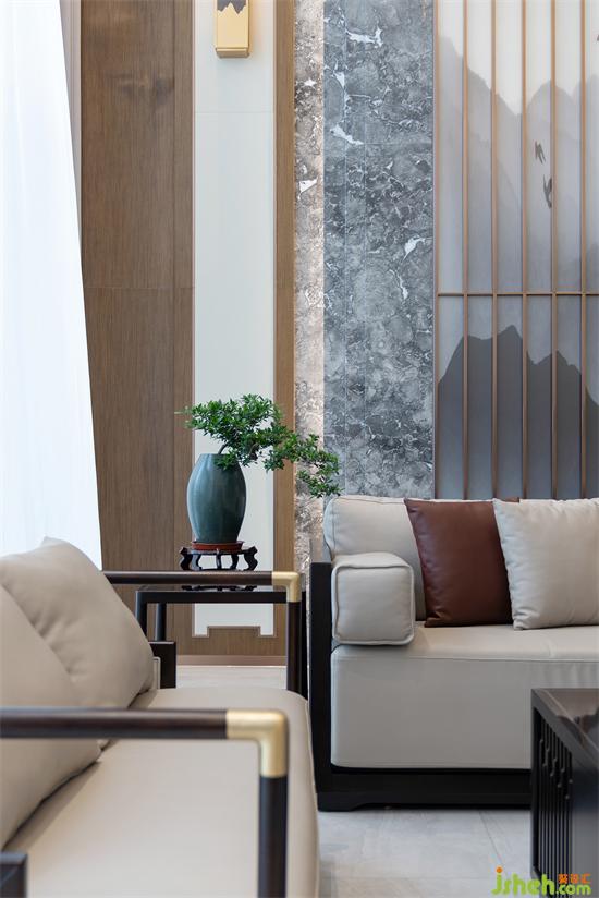 大理石與木質(zhì)不同色調(diào)的結(jié)合打造了空間的質(zhì)感和親切感,中式綠植的裝點(diǎn)讓空間更加有生氣,中式極簡的沙發(fā)造型、山水裝飾畫、中式擺件營造空間東方美的意境。
