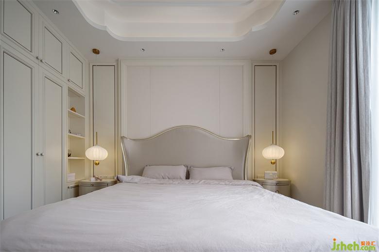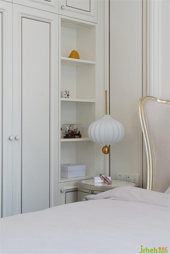 白色系兒童房為孩子打造了一個溫暖的童話世界,弧形吊頂增添裝飾性,定制衣柜特意設計了展示區(qū)域,裝下公主的心愛之物,兩邊對稱的吊燈營造著夢境。