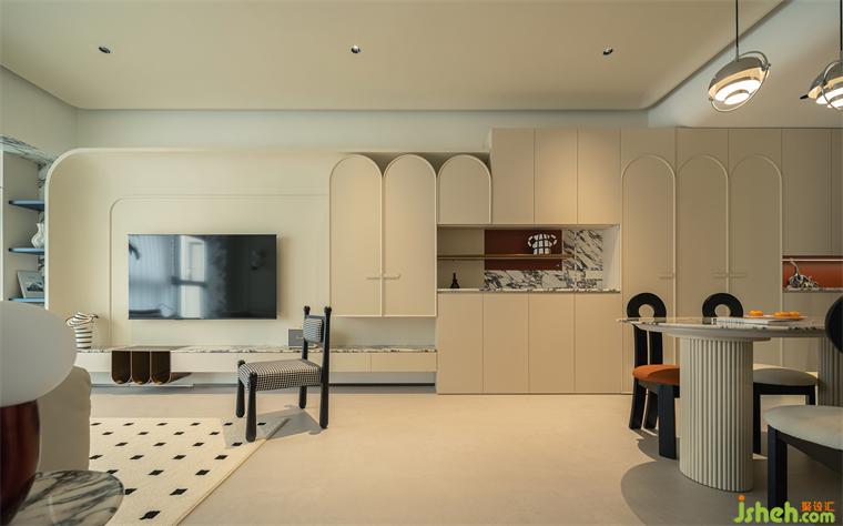 2、餐廳與公衛(wèi)之間做s形墻,使餐廚一體化且擴(kuò)大整個(gè)空間的比例。