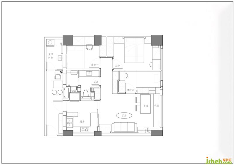 2、在主臥、次臥與衛(wèi)生間三處劃出過道區(qū)域,使得各處空間有了更多的私密性;