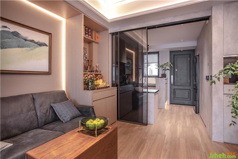 入戶便是廚房,與客廳相接。為了避免廚房油煙竄進(jìn)客廳,所有便在在廚房與客廳之間加裝上一道啡色自動門。做飯的時候,把門關(guān)上,避免油煙飄到客廳。平時便是打開的狀態(tài)。
