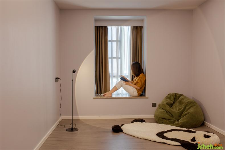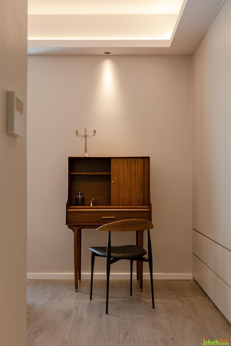 以簡(jiǎn)雅為韻調(diào)鋪墊的主臥,室內(nèi)設(shè)計(jì)師形室內(nèi)設(shè)計(jì)師式極簡(jiǎn)但功能一應(yīng)俱全??臻g材質(zhì)跟隨光影靈動(dòng),漸入到平和的氛圍中??梢苿?dòng)的窗臺(tái)茶幾、復(fù)古的梳妝臺(tái)桌把簡(jiǎn)約主義和實(shí)用主義的特點(diǎn)綜合,就像隱藏式的衣帽柜,打開(kāi)即是使用,關(guān)上即是生活的藝術(shù)和美。
