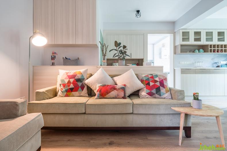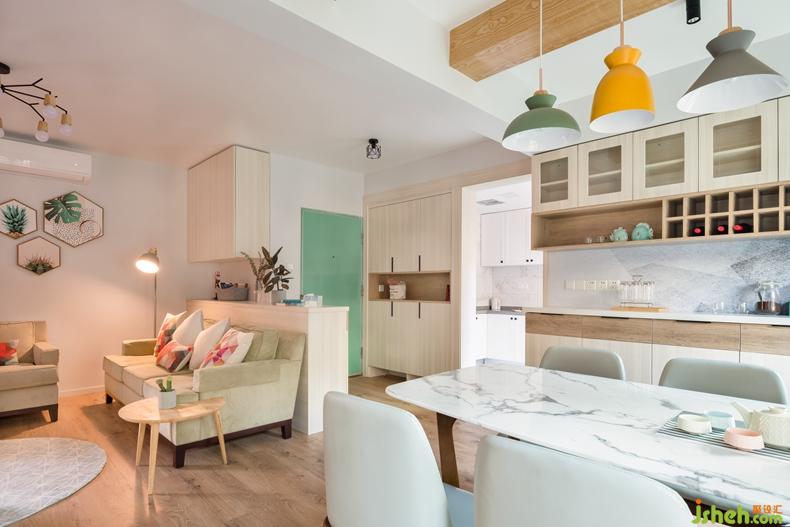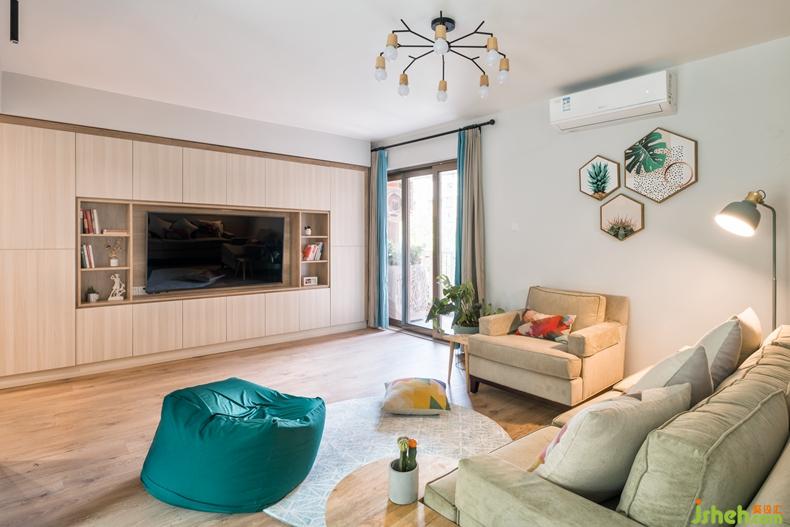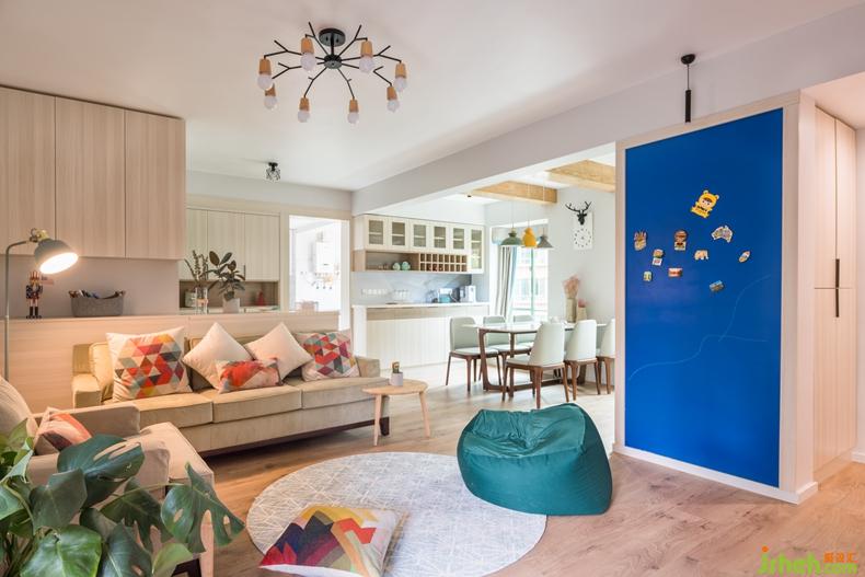 從門廳步入客廳,充滿絢麗色彩的空間傳達著這對年輕夫妻的熱情,富有無限活力的氛圍搭配不乏北歐小清新的干凈和明朗,以及令人忍不住想親近的木調(diào)作修飾,淡藍色調(diào)是空間里最美好的調(diào)色板,一股清涼,一種不俗的生活品味。室內(nèi)設(shè)計師
