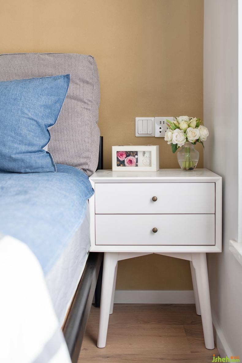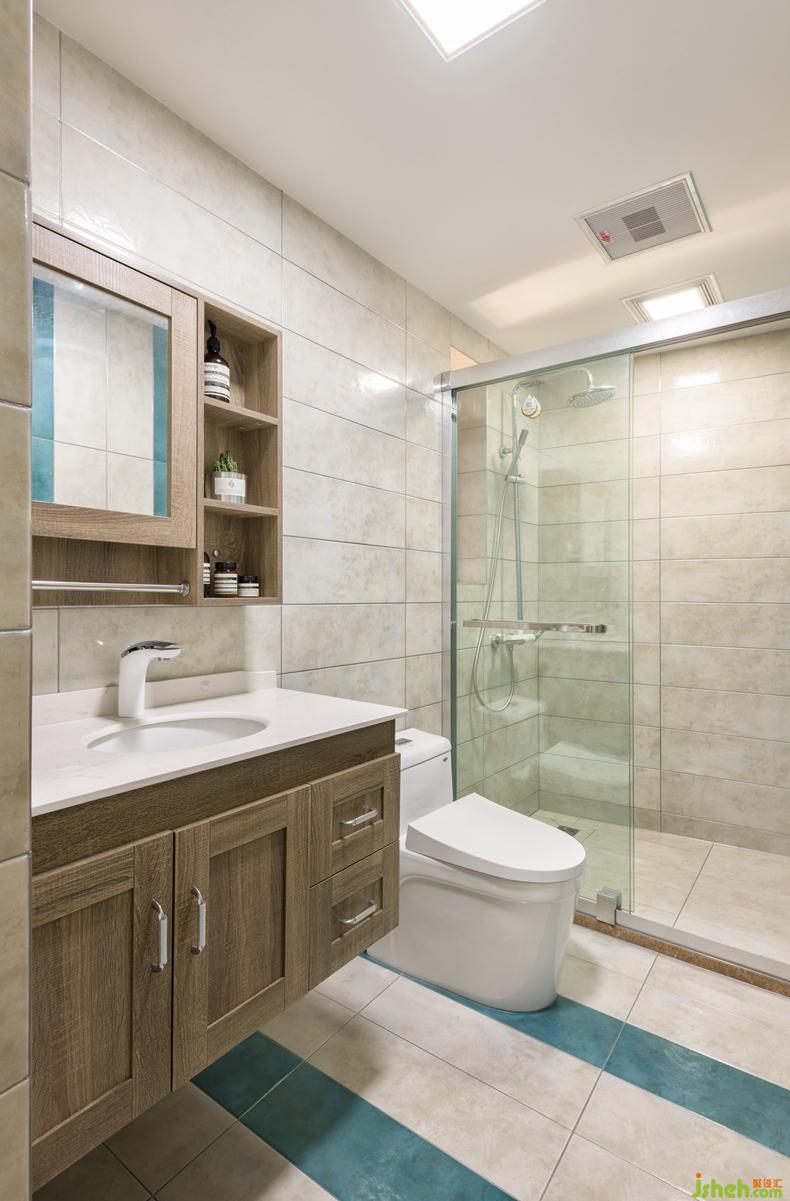 衛(wèi)生間里的玻璃隔斷很好的起到了干濕分離的作用,藍(lán)色的地板與空間形成鮮明對比,活躍了空間明亮度,顯得很好看。
