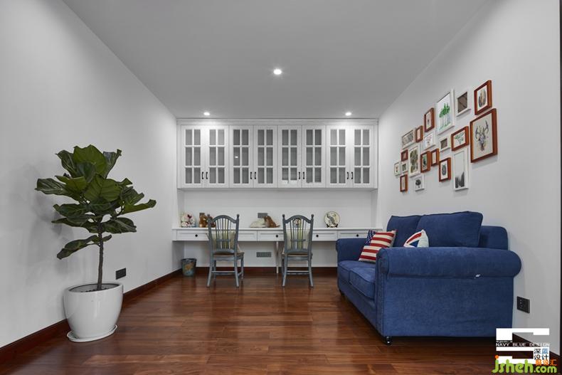 開放式起居廳,用于小朋友們學習和玩耍,靠墻的整排書桌與書柜,方便輔導作業(yè)和學習,舒服的布藝沙發(fā),互動與休息,墻上的家庭照片墻,增加親子氛圍。
