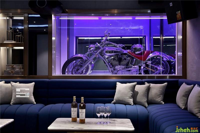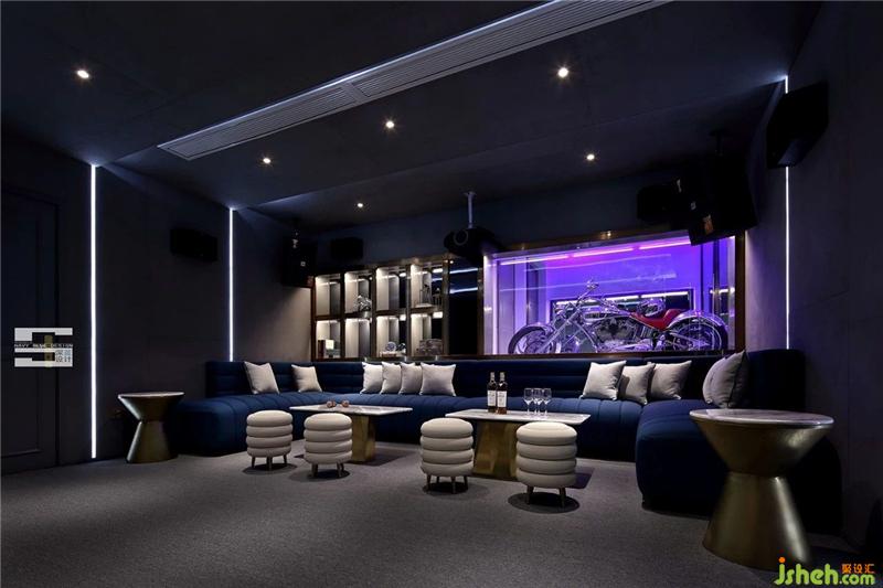 定制版的哈雷摩托車在整個空間中起到畫龍點睛的作用,在與業(yè)主溝通中,設計師了解到業(yè)主對哈雷摩托車的需求:既要展示,又要方便騎行。而影音室后面是車庫,設計師利用車庫剛好比影音室的地面高出1.1米的落差優(yōu)勢,定制了一個哈雷摩托車停車庫與影音室通透的展示柜,滿足了展示與實用的功能。