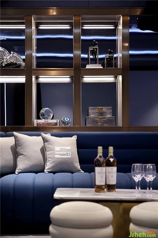 整個空間以灰色為主調,搭配科技感十足的燈光,讓空間更具層次感;圓潤造型的U型寶石藍絲絨沙發(fā)以及自然舒適的淺灰色抱枕、茶幾凳讓空間充滿溫馨感,在此容納家人促膝長談,談心嬉鬧的美好記憶;展示墻金屬邊框、金屬大理石茶幾、金屬椅腳等金屬元素在暗黑的影音室里散發(fā)一股低調奢華的氣息,卸除不必要的裝飾,所有線條克制而必須。