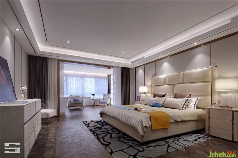 主臥作為業(yè)主私密與盡情放松的空間,細(xì)節(jié)決定品味,意大利真皮大床、柔軟的床品、絲絨面料抱枕等,或藍(lán)或黃的毯子和裝飾品,恰到好處點(diǎn)綴;主臥線條簡(jiǎn)約而克制,而木花紋地板與米白色家具柔和空間的硬度,使得室內(nèi)裝置與材質(zhì)建構(gòu)之間,多了一份簡(jiǎn)單、純粹、舒適的生活質(zhì)感;Cosmos限量版星際熊手辦、石紋進(jìn)口地毯,提升臥室的藝術(shù)感,彰顯業(yè)主的高貴品味。