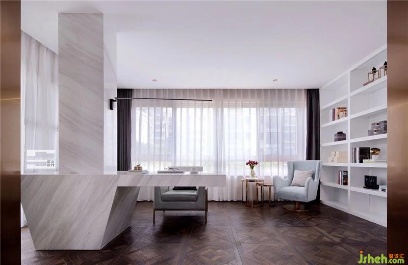 就像這個(gè)臥室,延伸出的小書房,簡(jiǎn)潔的家具包裹著材質(zhì)、紋理、觸感的細(xì)節(jié),無不表達(dá)出生活品質(zhì)的追求,可以靜坐窗邊聽雨,也可以品酒讀書,感受生活的質(zhì)感在指尖流淌。