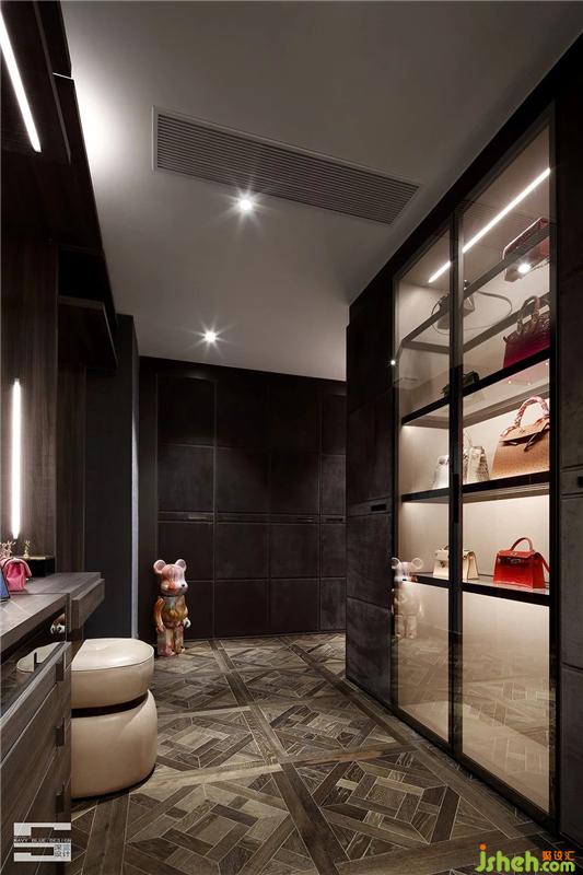 明亮的主臥與沉穩(wěn)暗黑的衣帽間形成鮮明對(duì)比。黑色布紋硬包的大衣柜充滿整個(gè)墻壁,大號(hào)BR@RBRICK積木熊屹立在轉(zhuǎn)角處,大型展示柜陳列著女主人的心頭大好----款式不一的Hermes包包,濃郁的輕奢感溢滿而出。走進(jìn)衣帽間,對(duì)鏡貼花黃,你就是這里的女王。