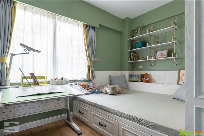 次臥是兒童房,定制的柔和綠色連體書柜書桌組合,造型就像美式小木房子,風(fēng)格簡潔,卻實(shí)用性非常強(qiáng),即可以收納,也可以當(dāng)展示柜使用。