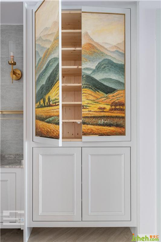 設(shè)計(jì)師了用過道的優(yōu)勢,將衛(wèi)生間洗手臺外置,緩解衛(wèi)生間的空間緊張感,又增加便利性;門廳的鞋柜上的鄉(xiāng)村風(fēng)景畫,豐富飽滿的自然色彩,透露出一股溫暖的氣息,讓人浮現(xiàn)《最后、起始,現(xiàn)在》里的“最后的一朵月季格外猩紅,最后的一片野菊格外嬌黃,最后的一片荷田、金的梗上垂著枯葉”,詩意滿滿。