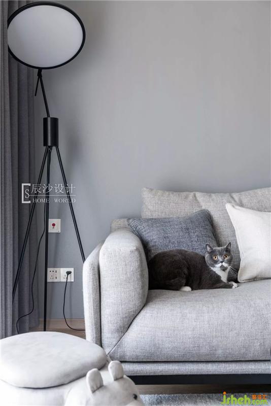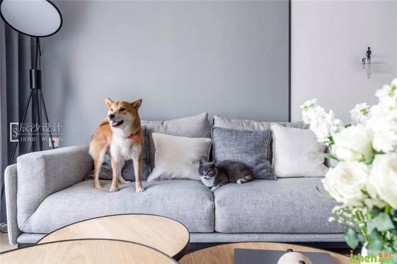 打開家門,引入眼簾的便是木質(zhì)的儲物柜、電視柜,加上茂盛清新的綠植,整個(gè)客廳散發(fā)出自然的氣息。冷灰色布藝沙發(fā)搭配黑框原木小茶幾,提升了空間的舒適度。一人、一狗、一貓依偎在沙發(fā)上,享受靜謐溫馨的時(shí)光。