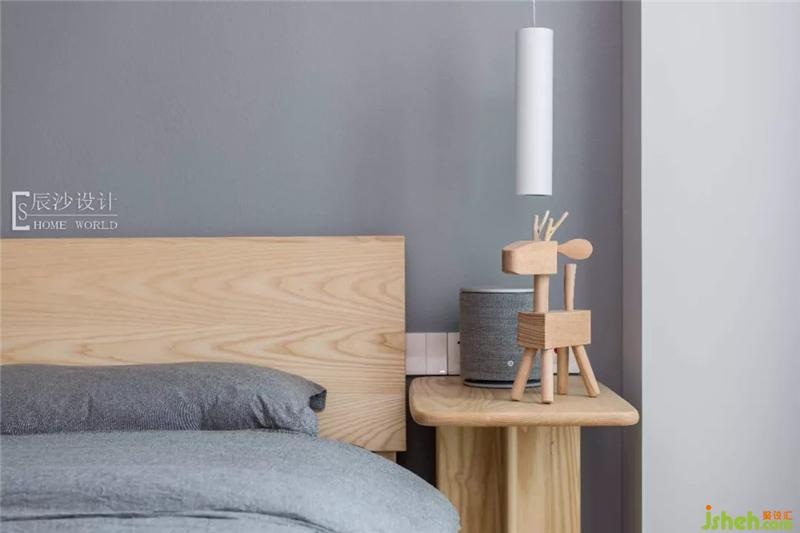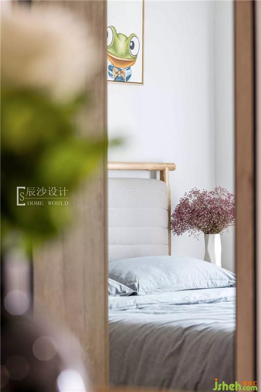 次臥就像一個小森林般自然、清新,原木床搭配淡藍色的床單,一旁的粉色干花,一呼一吸都是那么的柔和。墻上的卡通掛畫就像森林里的動物,空間變得充滿活力。室內(nèi)設(shè)計師