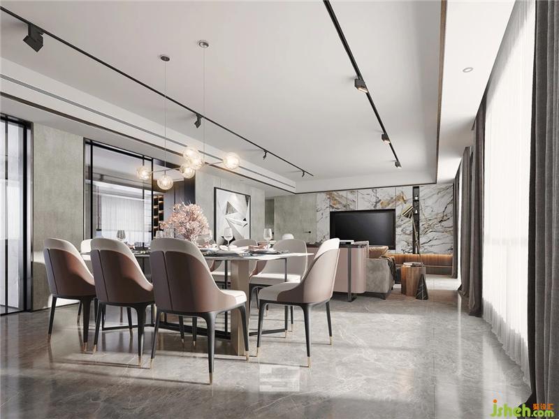 Using the contrast of colors to blur the boundary between the spaces, and also maintains the independence of the spaces. The integration of dirty pink and light brown is advanced and gentle. The graceful metal chandelier and metal dining chair foot echo from the top to the bottom, and the noble and elegant atmosphere moves through he whole room.