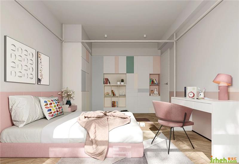 The girl's room, which is made of pink and white instead of calm light gray and mature light brown, gives a feeling of innocence, liveliness and romance, which is in line with the characteristics of little girls. The bookcase and wardrobe designed by splicing are a highlight of the space. The soft are mainly made of simple and elegant materials, and the high-level and elegant feeling is very compatible with the whole room.