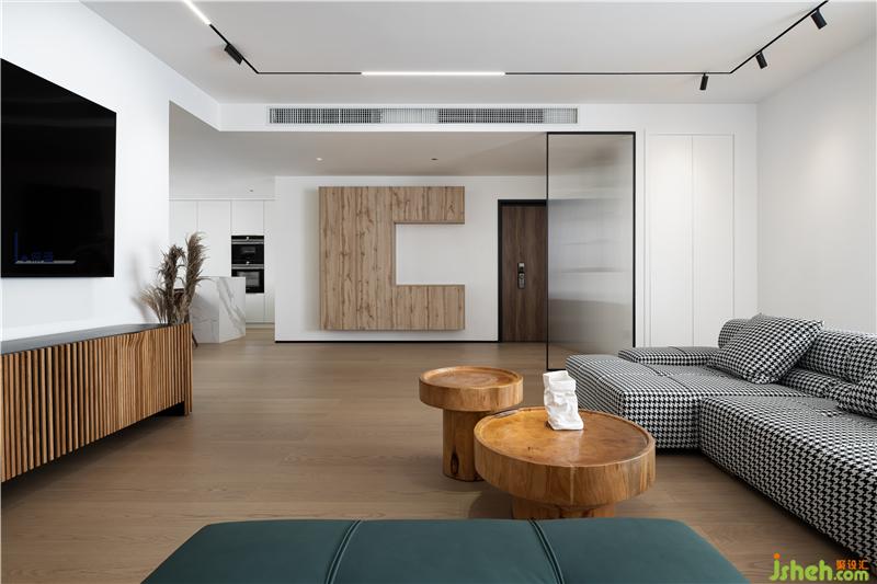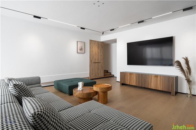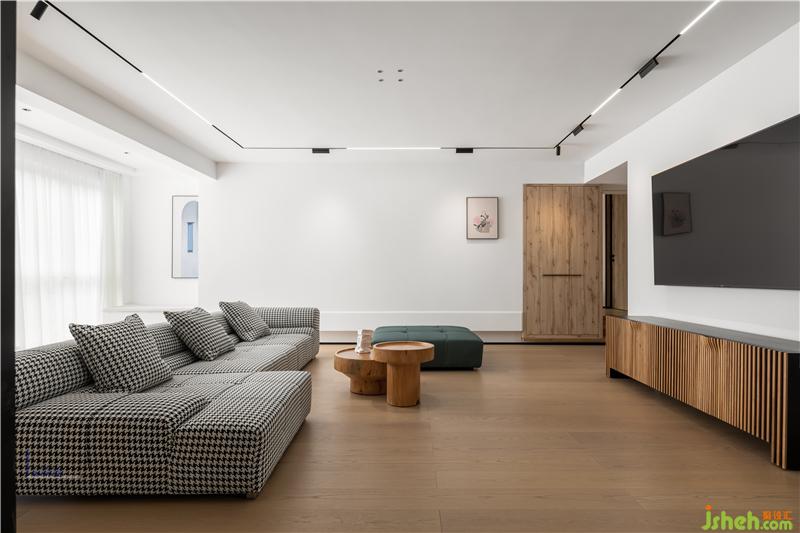 客廳以極簡的線條造型和色塊搭配出來現(xiàn)代休閑的度假式空間。大面積白色和木色形成了空間的主題。沙發(fā)采用千鳥格布藝材質與墨綠色搭配,成為空間的點睛之筆。