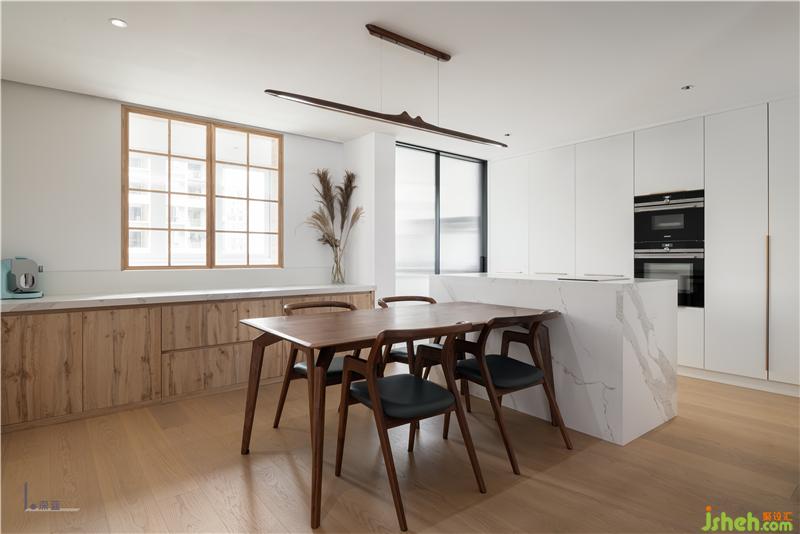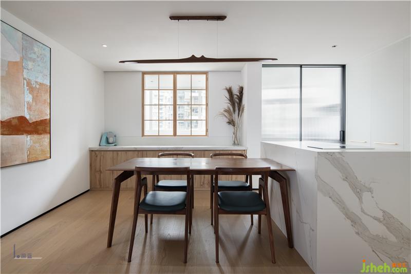 餐廳和西廚融為一體,魚肚白巖板做導(dǎo)臺,和木色餐桌結(jié)合搭配山水主題的餐廳主燈。讓就餐氛圍多了一些自然的溫度。