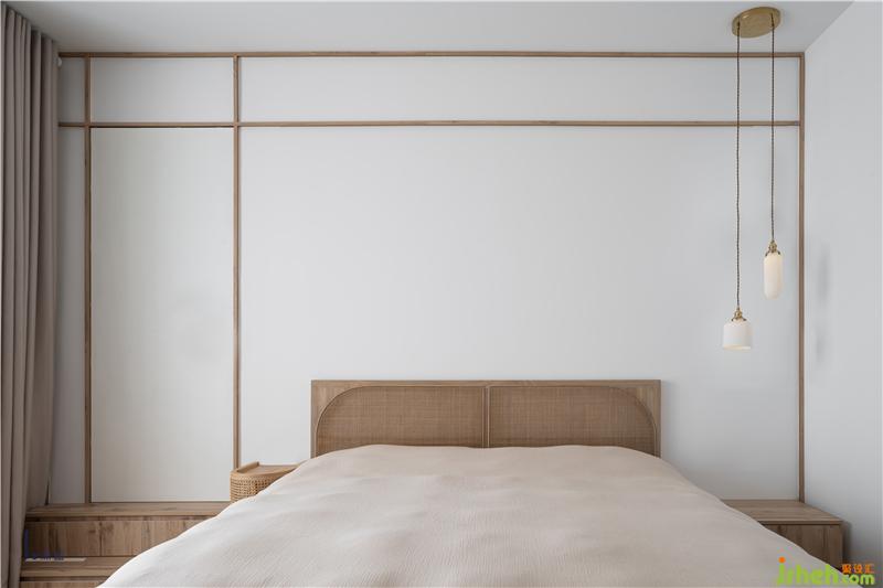 主臥以木色線條勾勒出空間立體輪廓,家居設(shè)計以木色、白色、咖色為主。溫潤的色系讓整個睡眠空間更加安靜平和。藤編的床頭和床頭柜讓睡眠空間更加休閑度假感。