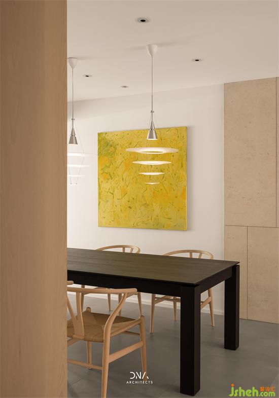 餐廳吊燈是來自Louis poulsen的Enigma 425,它通過不同大小的環(huán)狀,將光源逐步遞進(jìn)到桌面,呈現(xiàn)出柔美的間接照明,其舊房改造設(shè)計(jì)師內(nèi)山昭一一直致力于創(chuàng)造無眩光的間接照明燈具,讓物體變得美麗,讓人們感受舊房改造到物體的質(zhì)感和深度。
