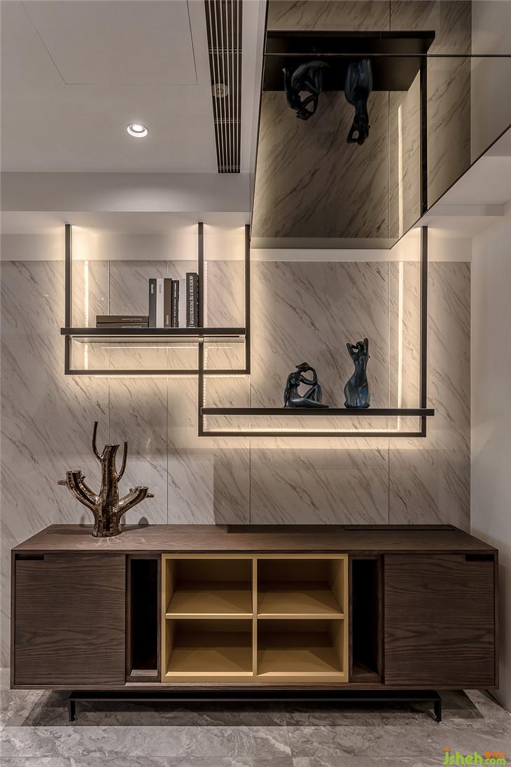 1. 玄關(guān)區(qū)域:采用鐵件、木飾面、燈光作為端景造型