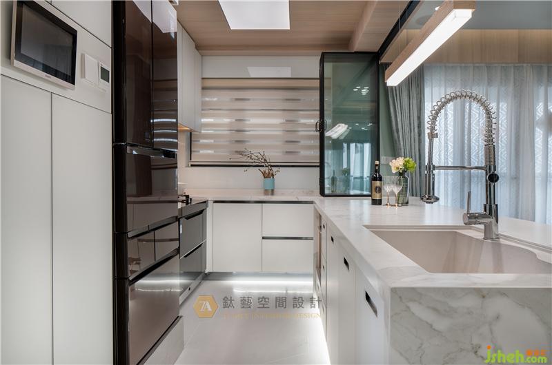 廚房趟門軌道與吊頂有秩序的結(jié)合,同一空間內(nèi)收放自由轉(zhuǎn)換,可封閉、可開放,實(shí)現(xiàn)空間的靈活多變性??臻g的相互流通與連接也將生活的重心擴(kuò)散到整個(gè)住家空間。