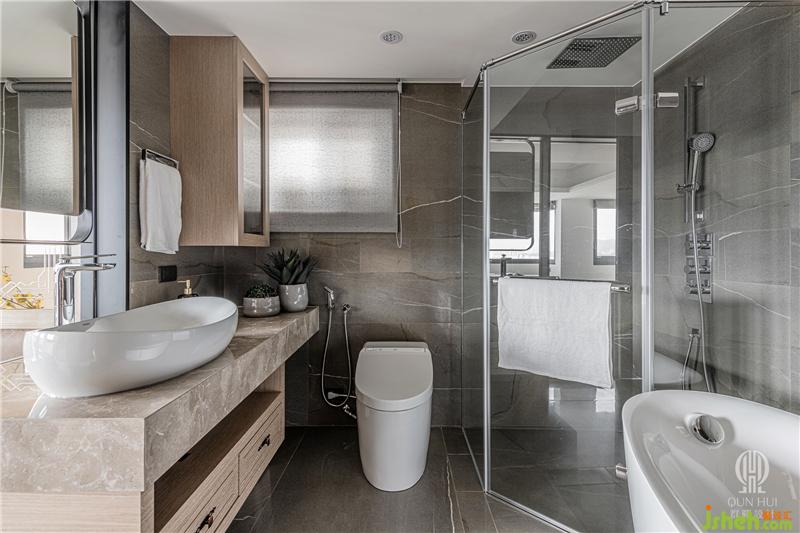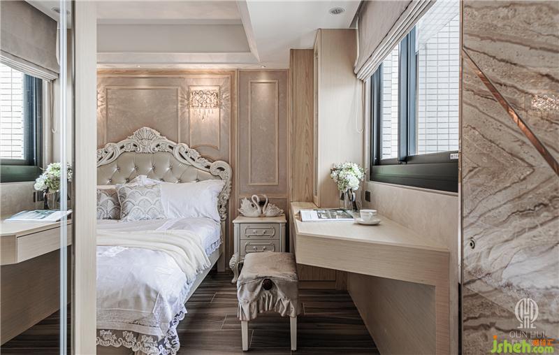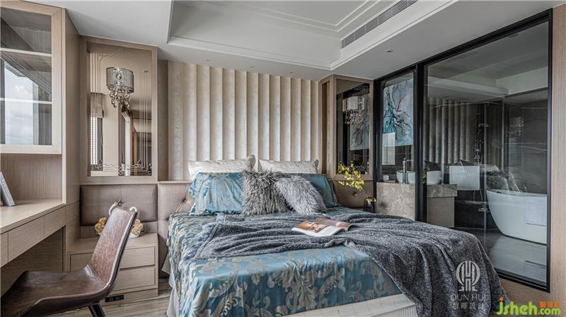 別墅設(shè)計(jì)中,主臥室明確隔間區(qū)分出睡臥、洗浴及更衣三大機(jī)能,其中浴室以清波門片增加采光,換衣間則采用拉門設(shè)計(jì),確保隨心換裝的隱私空間。安排完整體機(jī)能后,設(shè)計(jì)師著手深入細(xì)節(jié),延續(xù)木紋磚地坪的色彩,于滑門電視墻運(yùn)用珍珠母貝薄片拼貼,床頭主墻則以波浪立體造型施以藝術(shù)涂裝,特殊漆面在曲面反射下,使得每個(gè)觀賞角度皆能看到不同的珍珠光彩;臨側(cè)的定制書桌及柜體,采用木質(zhì)搭建并嵌合大面茶鏡,夾敘位于中央的場(chǎng)域要角——床鋪,為淡雅環(huán)境刷上一筆青藍(lán),當(dāng)每晚床頭燈亮起,便又完成一處剔透的夢(mèng)幻場(chǎng)景。