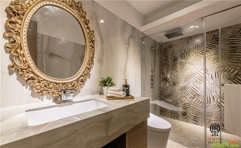 馥郁的草葉壁磚配上梳妝鏡的花草邊飾,接連為簡(jiǎn)約場(chǎng)域?qū)肷萑A而飽含生命力的美學(xué)意象。