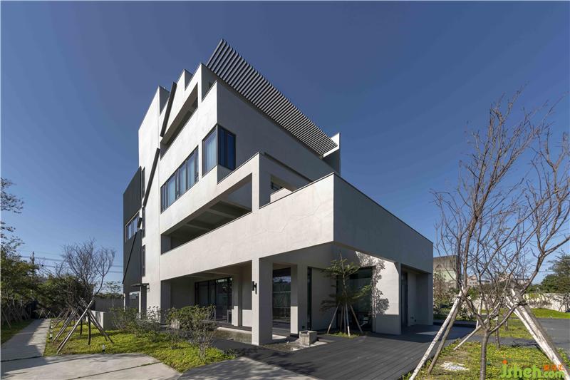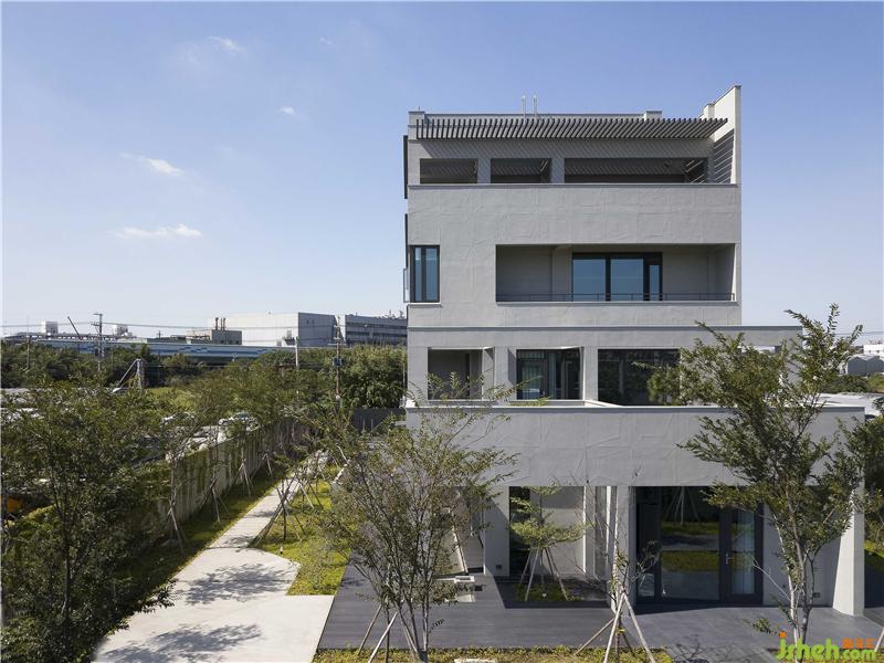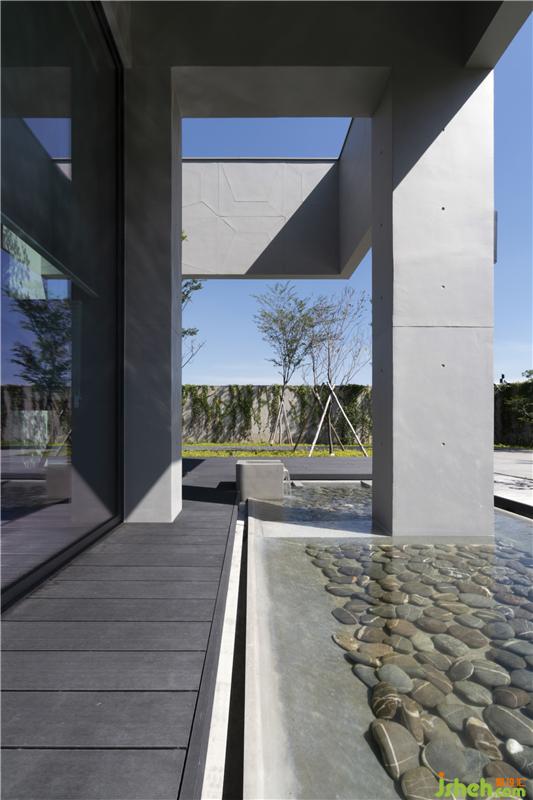 在綠意之內(nèi),以清水模為材質(zhì)的幾何狀外觀,內(nèi)斂并和善地與環(huán)境互動(dòng),讓四時(shí)遞嬗隨著清新空氣,滿布整個(gè)量體當(dāng)中。
