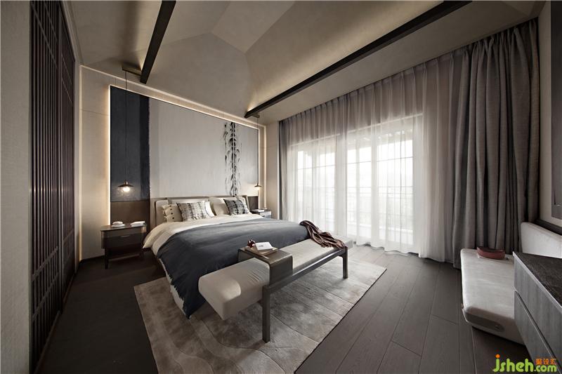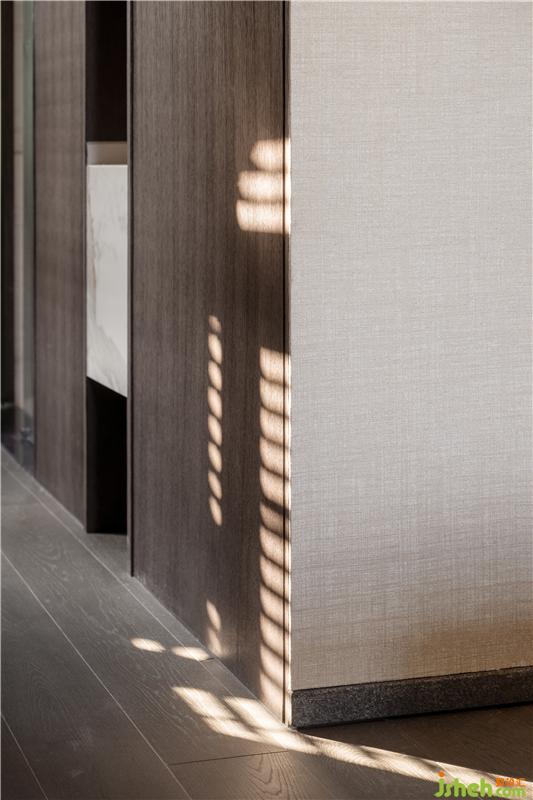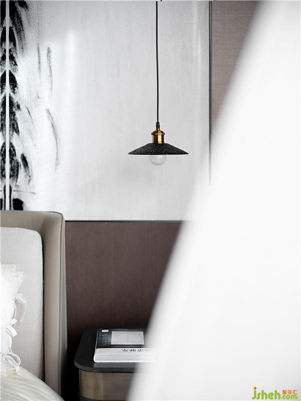 The master bedroom still continues the linear space moving line, the palm wood floor is combined with the beige and hemp wall, and the Japanese hand-painted silk painting at the head of the bed skillfully outlines the sense of space hierarchy. Living life and the natural response outside the window make the clean, simple and plain base more energetic and vital.