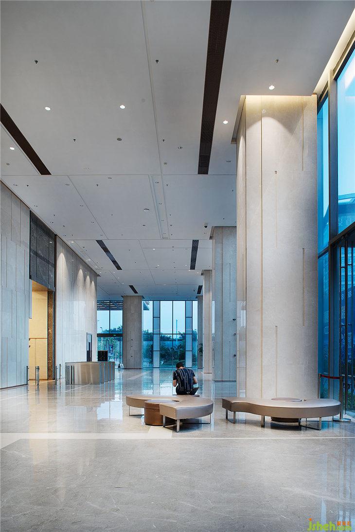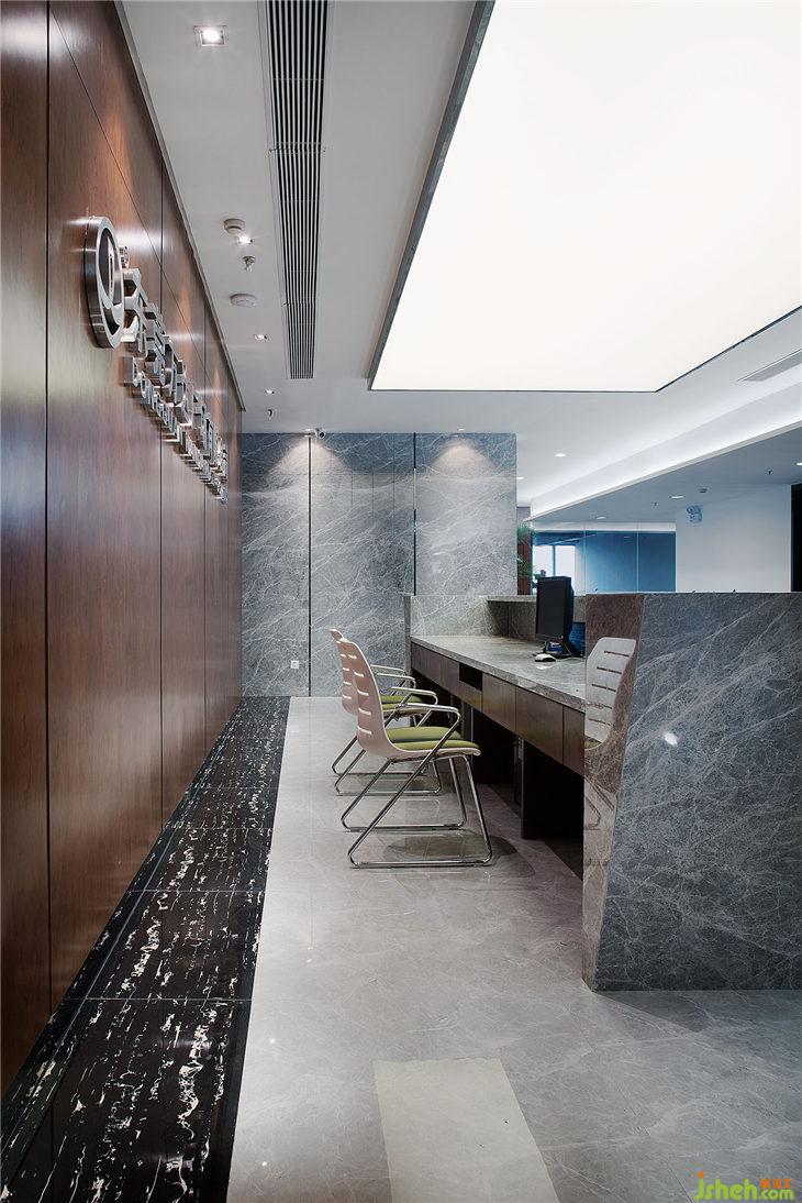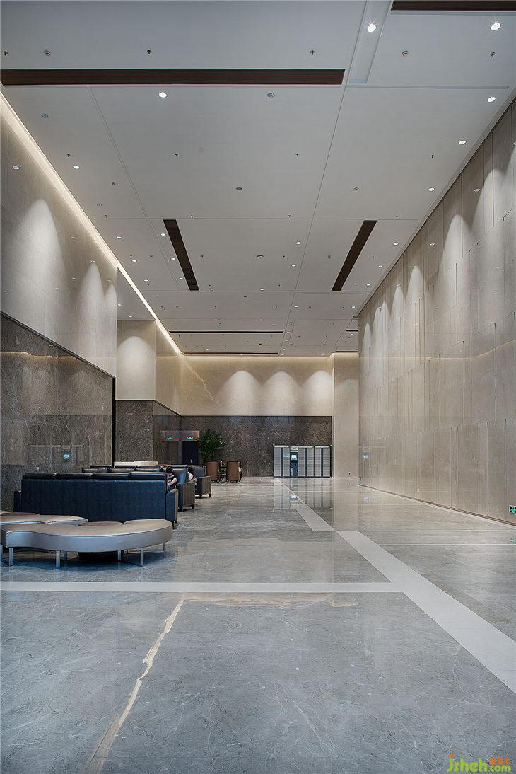 大廳比較注重大氣、開敞、嚴(yán)謹(jǐn)、莊重,所以我們運(yùn)用灰色大理石,深色木飾面以及白色軟膜、白色油漆。在形式上講究一個(gè)“一”字表現(xiàn),行業(yè)第一、中國(guó)第一、亞洲一?;ㄖ幸浴耙弧痹赜密浤ぜ盁艄庾隽艘粋€(gè)大大的“一”字。其二,大辦公室天花保留原頂, 享受更高的空間,保持內(nèi)部更多的空氣,綜合區(qū)辦公可容納50—60人同時(shí)辦公,開闊又明亮,同事間的互動(dòng)增強(qiáng),也提升了辦公效率,又不失嚴(yán)謹(jǐn)。過道是大辦公室的重頭戲,體現(xiàn)了出大企業(yè)的氣場(chǎng)。大會(huì)議室的天花與建筑外觀的小塊豎條造型形成呼應(yīng),用簡(jiǎn)單的線條勾畫出九個(gè)區(qū)域、形成“九五之尊”之意。
