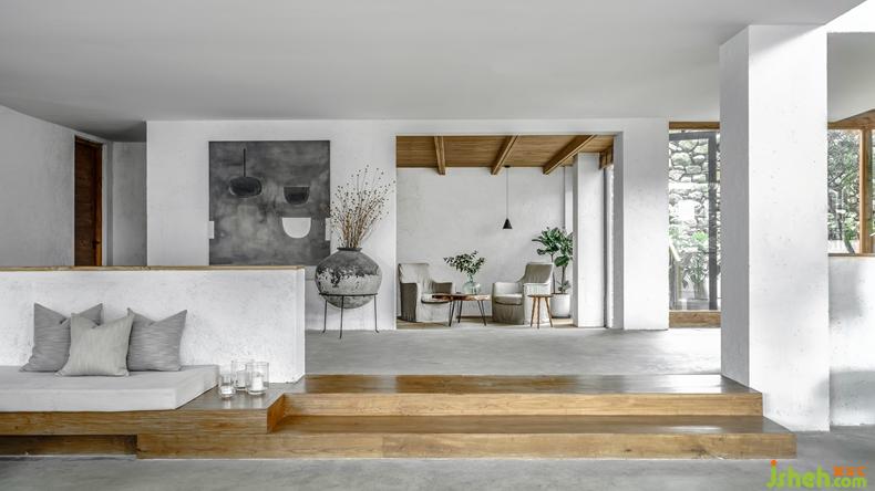 The entrance is located at the corner of the building, low-key and humble, down the steps, a ten-year red fruit tree stands in the center of the pool, it attracts people's attention instantly. Turning to the mottled entrance porch, we enter the reception hall and begin to experience the space in a daily and pure way. The public area takes the central stove as the visual center, the 2 layered spaces are the core of the entire ground floor. Other functional facilities, such as the reception center, book bar, dining area, inner and outer courtyards are unfolded around them. The lower-leveled courtyards in the front and back of the hall effectively solved the problem of elevation difference brought by the slopes, and also avoided the interference of traffic flow on the main road, therefore, a warm and interesting space was created. The bright sunshine in Dali, simple stones, warm wood, eclectic furniture and white walls form a dialogue in the spatial order, which is quiet and graceful, warm and comfortable.