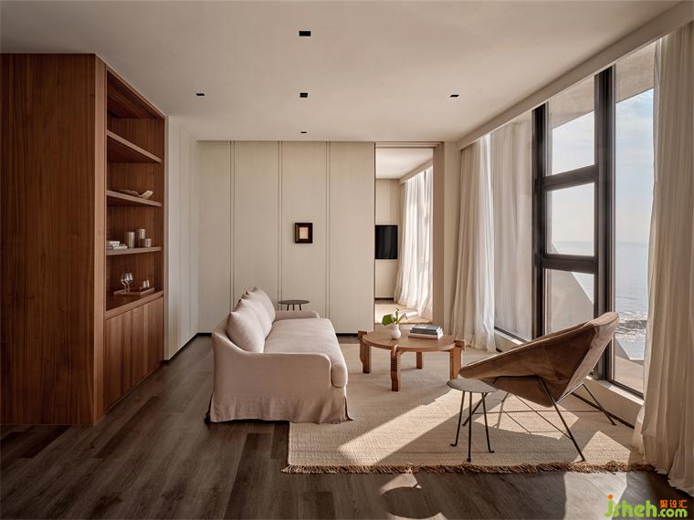 酒店設計延伸并保留至大堂的原始礁石,是被自然賜予的禮物,成就了空間的氛圍主題,通透的弧形場域,為人在進入的那一刻,感受時間沉淀的靜謐,設計將重點放在結構和材質上,縱向分隔的樓梯成為一組打開的畫卷,大體量的石塊成堆疊之勢,與海灘的天然礁石形成對話。石柱、石材、礁石形成新的秩序,保留check-in的功能之外,以退隱的方式凸顯質樸的自然,站在窗景前,如同泉州三灣向大堂展開擁抱,人們在此尋找庇護和獨處,收獲巨石之下肅穆的詩意之美。