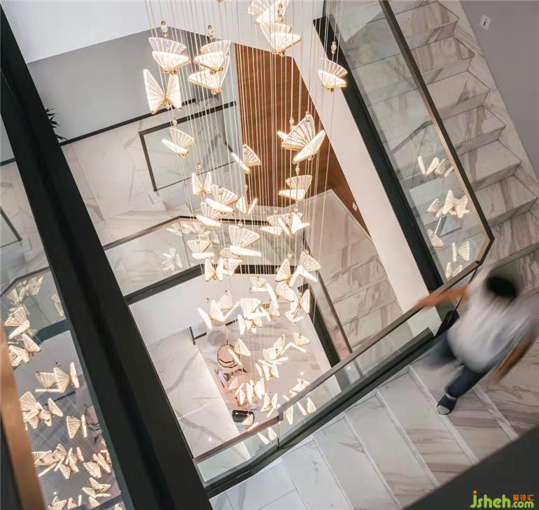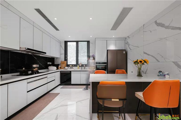 錯(cuò)位擺放的橙色茶幾成為整個(gè)空間的視覺(jué)亮點(diǎn),宛如風(fēng)鈴般垂吊的燈飾與之呼應(yīng),廣州別墅設(shè)計(jì)不拘一格的家具選擇和強(qiáng)烈的裝飾元素增添了些許厚重,帶來(lái)頗具韻味的故事感。