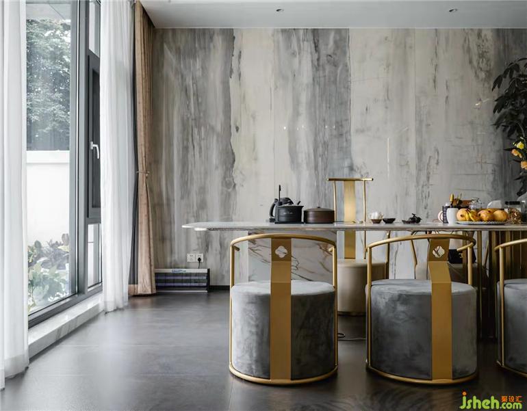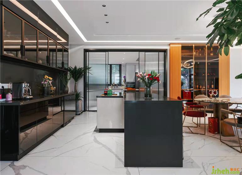 餐廳與吧臺(tái)結(jié)合,重新定義了餐廳的布局,極大地提高空間利用率。不銹鋼材質(zhì)的金色餐桌與金色鑲邊的布藝餐椅,給人帶來(lái)高貴寧?kù)o的氛圍,環(huán)形交錯(cuò)的燈飾帶來(lái)光與影的動(dòng)態(tài)美感,于角落布置橙色酒柜,彰顯了餐廳高雅的格調(diào)。